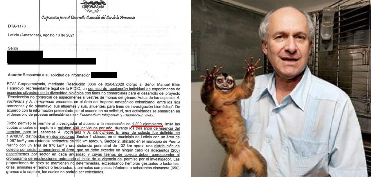 Con respecto a la primera pregunta, la respuesta es lamentable para los esfuerzos de conservación de la fauna del amazonas. Mediante Resolución 0366 de 02/04/2020 Corpoamazonía otorgó al Señor Manuel Elkin patarroyo, representante legal de la FIDIC, un permiso de recolección individual de especimenes silvestres con fines no comerciales para el desarrollo del proyecto "Recoleccion no comercial de especímenes silvestres de monos del género Aotus de las especies A. Vociferans y A. nancymae presentes en el trapecio amazónico (...)". De acuerdo con la información presentada por Patarroyo, las actividades de enmarcan en el desarrollo de pruebas antimaláricas con Plasmoidum falciparum y Plasmoniun vivax. Dicho permiso le permite el acceso a la recolección de 1200 ejemplares, limitando las cuotas anuales de captura a un máximo de 400 individuos por año durante 3 años de vigencia